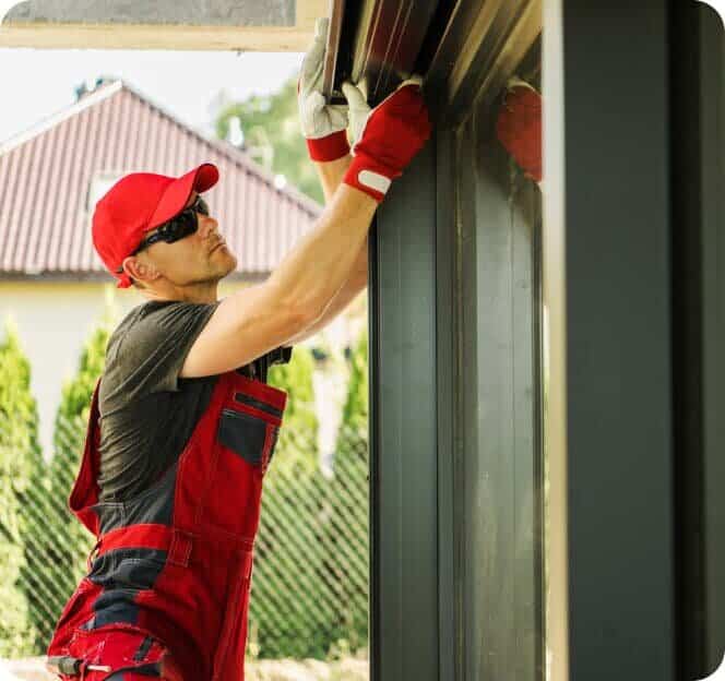 A man in a red cap, sunglasses, and overalls installing a garage door in a residential area.